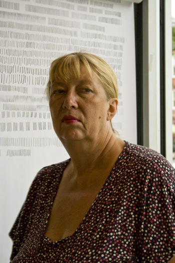 Walking Marking 2 performance still. Walker-marker Barbara Stewart at A.P.E. Gallery. Northampton, MA, August 3, 2010. "The power of this project, for me, lies in the willingness to participate... To accept who we are, as opposed to who we're supposed to be for our families, our colleagues, our community. I walk, therefore I am. I mark, therefore I am. I am willing to be repetitive, to be perceptive, to be conscious of every step I take, every breath I take, every mark I make on this world."